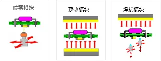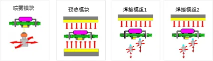 預(yù)熱模塊由底部預(yù)熱、頂部預(yù)熱、焊接保溫模塊組成。各溫區(qū)獨(dú)立循環(huán)、獨(dú)立控溫??筛鶕?jù)產(chǎn)品尺寸,自動(dòng)關(guān)閉產(chǎn)品尺寸范圍外的加熱,節(jié)能簡(jiǎn)單。