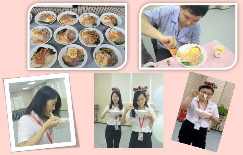 糖心荷包蛋、肉絲、胡蘿卜雕刻的“生日快樂“,組成這一碗代表公司對壽星們美好祝福的長壽面,一口下肚有沒有小時(shí)候的感覺!