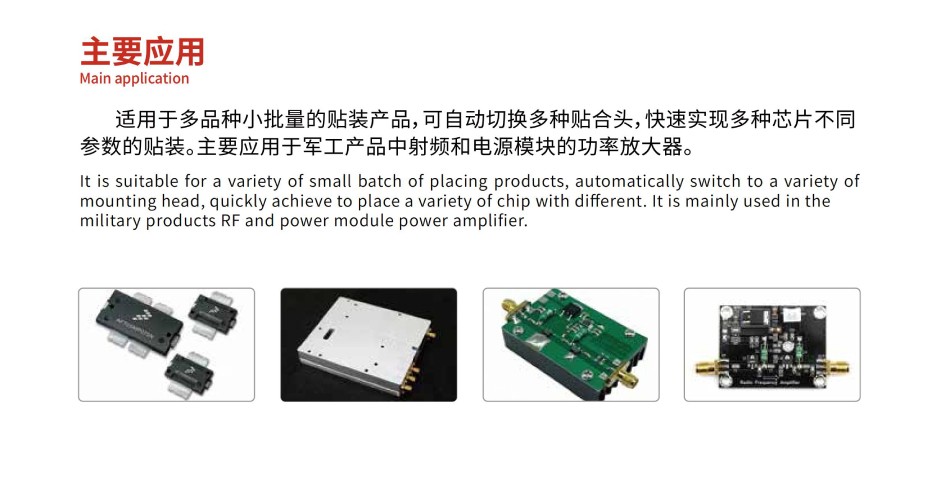 專用型高精度固晶貼合機,適用于多品種小批量的貼裝產(chǎn)品,可自動切換多種貼合頭,快速實現(xiàn)多種芯片不同參數(shù)的貼裝。主要應(yīng)用于軍工產(chǎn)品中射頻和電源模塊的功率放大器。